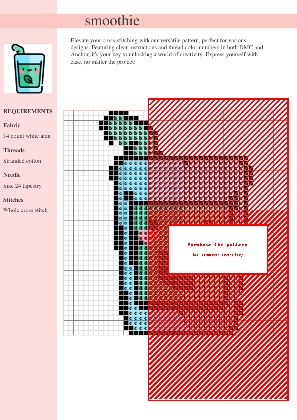 Unleash your creativity with our delightful Smoothie Cross Stitch Pattern! This modern and vibrant design is a refreshing take on cross-stitch, perfect for crafters of all skill levels. The easy-to-follow, two-page pattern includes a detailed color-coded chart compatible with both DMC and Anchor threads, ensuring a smooth stitching experience. A comprehensive thread list is provided, eliminating any guesswork. Download your PDF pattern instantly and begin your creative journey! Imagine this cheerful smoothie adorning your walls as unique wall art, adding a whimsical touch to tote bags, pillows, or other home décor projects. The vibrant color palette and intricate details make stitching a joy, resulting in a treasured piece. Let your needlework tell a tasty story! This pattern is ideal for beginners and experienced stitchers, offering a delightful blend of modern design and classic cross-stitch charm.