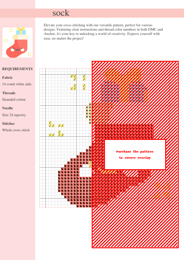 Downloadable PDF cross-stitch pattern of adorable socks! Featuring color charts for both DMC and Anchor threads, this pattern provides easy-to-follow instructions for a satisfying crafting experience. Perfect for beginners and experienced stitchers alike. Add a cozy charm to your projects, gifts, or home décor!