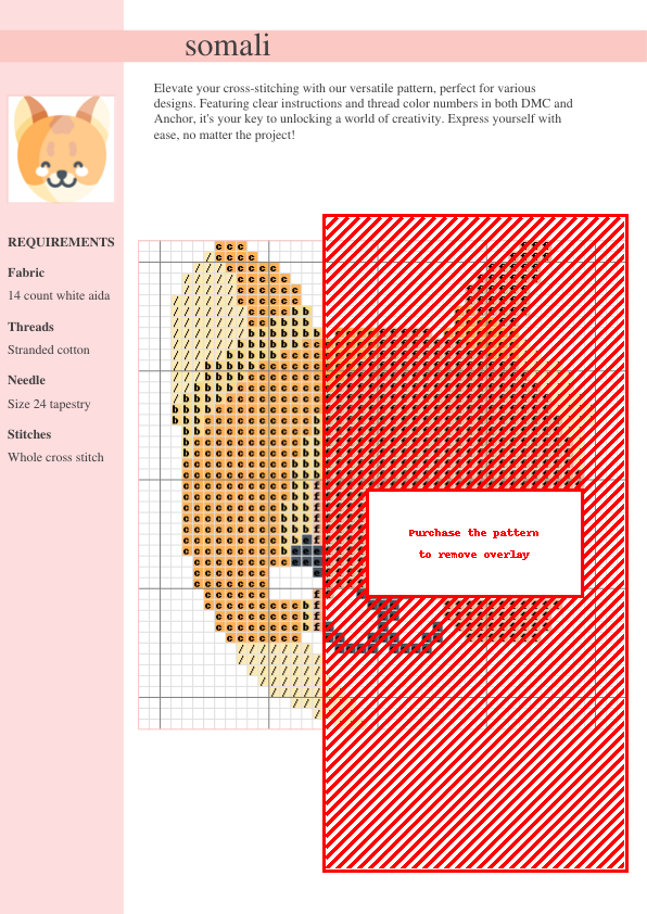 Stitch up a purrfectly charming Somali cat with this delightful cross-stitch pattern! This easy-to-follow PDF download features a clear, charted design with symbols, a complete list of DMC and Anchor stranded cotton threads, and detailed instructions. The pattern beautifully captures the unique ticked tabby markings and elegant posture of a Somali cat, creating a realistic and captivating image. Its warm, earthy color palette—rich browns, reds, and creamy beige—adds depth and vibrancy to the finished piece. Perfect for beginners and experienced cross-stitchers alike, this pattern is ideal for creating a beautiful piece of home decor, a thoughtful handmade gift for cat lovers, or a rewarding personal project. The detailed instructions ensure a smooth stitching experience, making it accessible for all skill levels. Download instantly and begin stitching your own feline friend today! Enjoy the relaxing and creative process of bringing this adorable design to life. This pattern is a fantastic addition to your cross-stitch projects and a wonderful way to add a touch of whimsical charm to your home or create a special handmade gift. This design is perfect for needlepoint enthusiasts too!