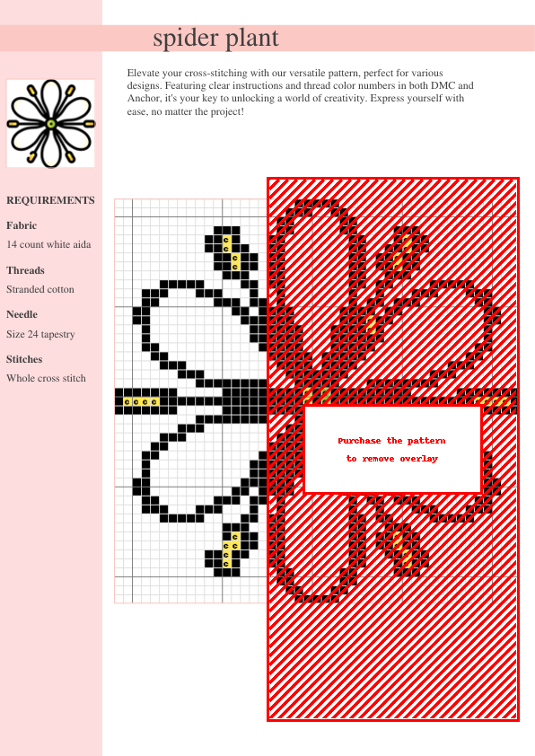 Create a beautiful spider plant cross stitch with this easy-to-follow PDF pattern! Includes DMC & Anchor thread color charts, is instantly downloadable, and perfect for beginners and experienced crafters. Add nature-inspired charm to your home or create a unique handmade gift!