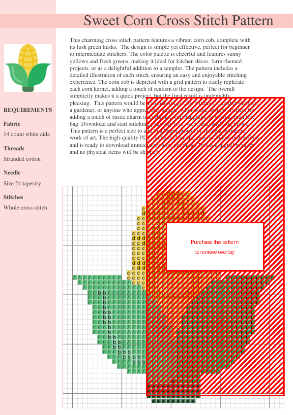 Stitch up a burst of summer with our adorable Sweet Corn Cross Stitch Pattern! This charming design features a vibrant corn cob peeking from its lush green husk, creating a cheerful, rustic scene perfect for stitchers of all skill levels, from beginner to intermediate. The sunny yellow and fresh green color palette evokes warmth and wholesomeness, making it ideal for kitchen décor, farm-themed projects, or as a delightful addition to a sampler. The pattern boasts meticulously detailed corn kernels using a grid pattern for added realism and depth. Imagine the rustic charm it will add to cushions, wall hangings, tote bags, or even a charming tea cozy! This pattern is the perfect size for adding to a larger project or creating a standalone miniature masterpiece. A wonderful gift for gardeners, farmers’ market enthusiasts, or anyone who appreciates simple, wholesome designs. This high-quality PDF pattern includes clear, easy-to-follow instructions and is ready for immediate download after purchase. (Digital download only – no physical product will be shipped). This pattern is perfect for adding a touch of country charm to your home decor or as a unique gift for a loved one.