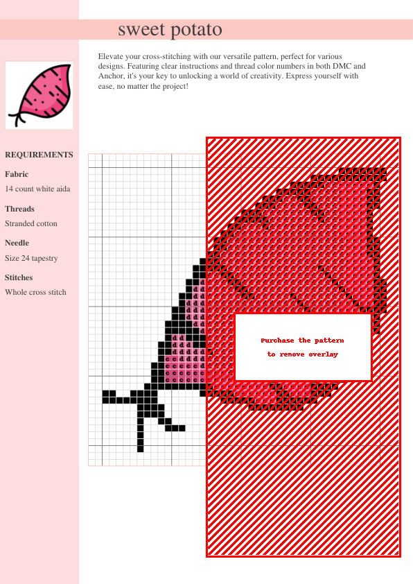 Stitch up a charming sweet potato with our delightful cross-stitch pattern! This versatile design is perfect for adding a touch of autumnal warmth to your home décor, creating unique gifts, or embellishing clothing and accessories. The detailed design showcases the sweet potato’s texture and earthy tones, making it a rewarding project for cross-stitchers of all skill levels. We’ve included clear, easy-to-follow instructions and a comprehensive color key with both DMC and Anchor thread color codes for seamless stitching. Download your instant PDF pattern after purchase, featuring the complete design chart with symbols. This sweet and satisfying project is perfect for beginners and seasoned stitchers alike. Imagine cozy autumn evenings spent stitching this charming design, perfect for adding a touch of harvest warmth to your home or creating a heartfelt handmade gift. Let your creativity bloom this harvest season! This pattern is ideal for cross stitch beginners and experts alike.