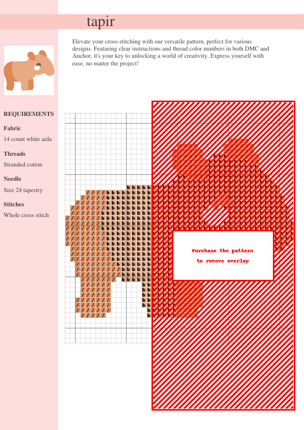 Embark on a whimsical cross-stitch adventure with our charming Tapir pattern! This delightful design is perfect for both beginner and experienced stitchers, offering a rewarding project with a touch of the exotic. The pattern showcases an adorable tapir in a captivating pose, meticulously detailed for a seamless stitching experience. The easy-to-follow symbol chart is accompanied by a convenient list of required DMC and Anchor thread colors, eliminating guesswork and ensuring a smooth crafting process. This instant download PDF pattern (two pages) provides the complete chart and thread list. Imagine the joy of completing this endearing creature, ready to be framed and displayed in your home, or stitched onto a special gift for a loved one. The earthy tones and cute design make it a perfect addition to any home décor or a heartwarming handmade gift. Stitch your own piece of the jungle! This pattern is ideal for cross stitch enthusiasts, animal lovers, PDF patterns, instant download projects, easy cross stitch, beginner cross stitch, animal cross stitch, and anyone seeking a fun and rewarding crafting project.