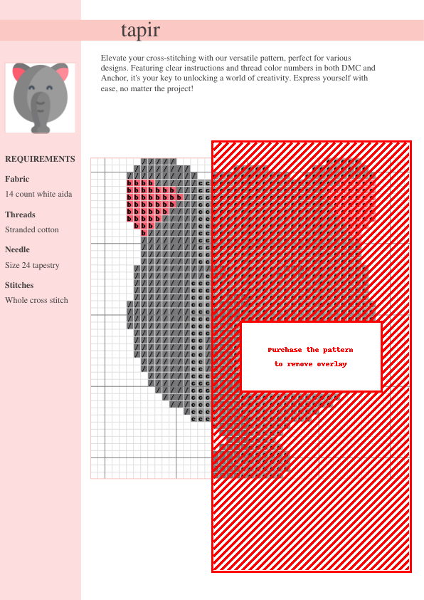 Embark on a stitching safari with our enchanting Tapir Cross Stitch Pattern! This adorable design captures the charm of a tapir in intricate detail, perfect for adding a touch of whimsical jungle flair to your home décor or as a unique, handmade gift. The pattern’s expressive eyes and textured fur provide a rewarding stitching experience for intermediate cross-stitchers. Clear, easy-to-follow instructions and a comprehensive color key featuring both DMC and Anchor thread numbers ensure a smooth and enjoyable project. This versatile pattern lends itself to various creations, from charming wall hangings and unique pillow covers to personalized gifts. Download your instant PDF pattern after purchase, containing both a symbol chart and a complete thread list. Unleash your creativity and bring this delightful jungle critter to life! This nature-inspired design is a perfect addition to any cross-stitch enthusiast’s collection. Intermediate skill level recommended. Includes color chart, DMC and Anchor thread conversion, and easy-to-follow instructions. Perfect for animal lovers and nature enthusiasts!
