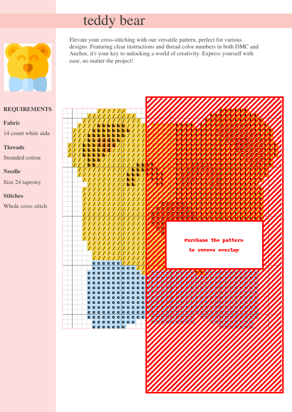 Stitch up some adorable charm with this delightful Teddy Bear Cross Stitch Pattern! Perfect for cross-stitch enthusiasts of all skill levels, this pattern features a captivating teddy bear ready to be brought to life with your favorite embroidery floss. Clear, easy-to-follow instructions and a comprehensive thread list including color codes for both DMC and Anchor threads ensure a smooth stitching experience. This instantly downloadable two-page PDF pattern includes a detailed symbol chart and complete thread lists. Create heartwarming gifts, unique home décor accents, or whimsical ornaments – the possibilities are endless! The design is perfect for beginners seeking a fun project and experienced stitchers looking for a charming addition to their portfolio. Let your creativity blossom and experience the joy of crafting with this adorable teddy bear cross stitch design. Perfect for adding a touch of heartwarming sweetness to your home or gifting to a loved one!