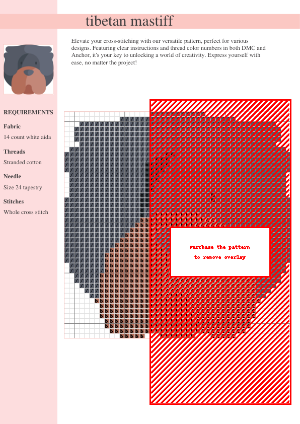 Stitch a majestic Tibetan Mastiff! This instant-download PDF cross-stitch pattern boasts a detailed design, DMC & Anchor thread color keys, and a clear symbol chart. A challenging and rewarding project perfect for intermediate to advanced stitchers. Create a stunning piece of needlework for your home or a unique gift!