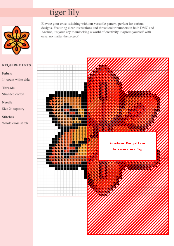 Unleash your creativity with our stunning Tiger Lily Cross Stitch Pattern! This vibrant floral design showcases a meticulously detailed tiger lily, perfect for adding a touch of elegant, nature-inspired beauty to your home décor or creating a thoughtful, handcrafted gift. The intricate details of the petals and leaves are brought to life through easy-to-follow instructions, making this pattern rewarding for cross-stitchers of all skill levels. Whether you’re a beginner looking for a fulfilling project or an experienced artisan seeking a beautiful challenge, this pattern is perfect for you. This comprehensive two-page PDF pattern includes both DMC and Anchor thread color codes for your convenience, ensuring a seamless stitching experience. A clear symbol chart and a comprehensive thread list simplify navigation, allowing you to focus on the joy of creating. Imagine this breathtaking tiger lily blooming on a pillow, wall hanging, or sampler – the possibilities are endless! Download your pattern instantly and let your creativity bloom! This pattern is also ideal for improving your cross-stitch skills and adding a unique piece to your crafting portfolio.