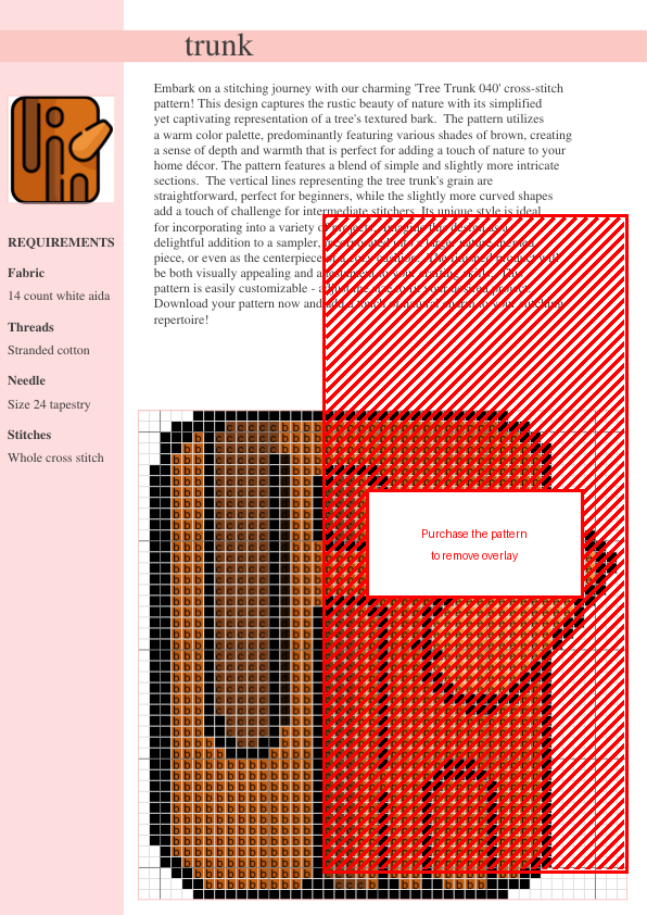 Embark on a stitching journey with our enchanting ‘Rustic Tree Trunk Charm’ cross-stitch pattern! This design captures the serene beauty of autumn with a simplified yet captivating representation of a tree’s textured bark. The pattern utilizes a warm and inviting color palette, predominantly featuring various shades of brown, beige, and muted greens, creating a sense of depth and warmth perfect for adding a touch of nature to your home décor. The pattern cleverly blends simple and slightly more intricate stitching sections. The vertical lines representing the tree trunk’s grain are straightforward, ideal for beginners, while the subtly curved shapes and textured bark details add a touch of challenge for intermediate stitchers. Its unique style is incredibly versatile, making it ideal for a variety of projects. Imagine this design as a delightful addition to a sampler, incorporated into a larger nature-themed piece, or even as the centerpiece of a cozy cushion cover, wall hanging, or ornament. The finished product will be both visually appealing and a testament to your crafting skills. This easily customizable pattern allows you to adjust the size to perfectly fit your desired project. Download your pattern now and add a touch of natural charm to your stitching repertoire! Perfect for autumnal decorations, fall crafts, nature-themed projects, rustic home décor, cross stitch samplers, and creating unique gifts. Instant digital download – PDF format. Includes color key and easy-to-follow instructions.