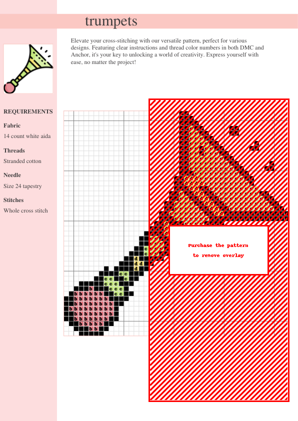 Unleash your creativity with our exquisite “Majestic Trumpets” cross-stitch pattern! This captivating design features a sophisticated arrangement of trumpets, perfect for adding a touch of musical elegance to your home or as a thoughtful gift. Designed for intermediate to advanced cross-stitchers, this pattern offers a challenging yet rewarding project. The clear, easy-to-follow instructions include both DMC and Anchor thread color codes for a seamless stitching experience. This downloadable PDF pattern (two pages) provides a complete symbol chart and a comprehensive thread list, ensuring a smooth and enjoyable crafting journey. Create a stunning wall hanging, a unique gift for a music lover, or integrate it into a larger sampler project. The elegant artistry of this design will ignite your crafting passion! Download instantly after purchase and begin creating your musical masterpiece today!