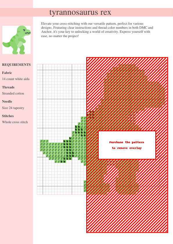 Unleash your inner paleontologist and stitch a magnificent Tyrannosaurus Rex! This captivating cross-stitch pattern brings a prehistoric beast to life with vibrant detail. The expressive T-Rex design is perfect for adding a unique, Jurassic touch to your home décor or creating a one-of-a-kind gift. This easy-to-follow pattern includes a comprehensive color key with both DMC and Anchor thread numbers, ensuring a smooth stitching experience for all skill levels, from beginner to advanced crafters. The high-resolution, two-page PDF download provides a large, clear chart and a complete thread list. The pattern showcases intricate details, bringing the T-Rex to life with texture and expression. Bring this majestic creature to life with your own creative flair and enjoy a challenging and rewarding crafting project. Download instantly and embark on your prehistoric stitching adventure! Perfect for dinosaur lovers, cross-stitch enthusiasts, dinosaur themed crafts, needlepoint, and anyone seeking a fun and engaging needlework project.