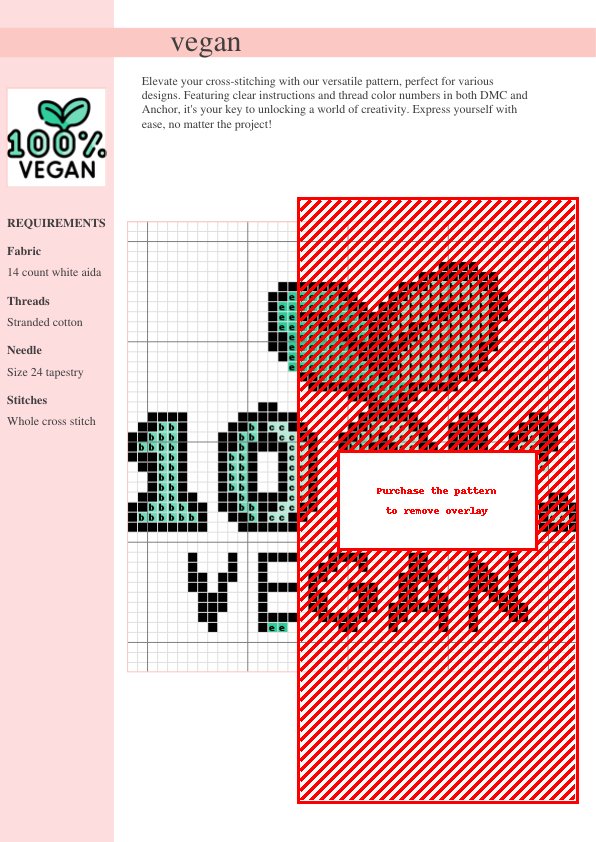 Unleash your creativity with this versatile and modern vegan cross stitch pattern! This downloadable PDF pattern offers a contemporary design, perfect for adding a touch of stylish flair to your home decor, crafting unique gifts, or expressing your personal style. The pattern includes clear, easy-to-follow instructions and a comprehensive thread color key using both DMC and Anchor thread numbers for a seamless stitching experience. Whether you’re a seasoned cross-stitcher or a beginner, this design is perfect for you! The two-page PDF instantly downloads after purchase, providing a detailed chart with symbols and a complete thread list. Customize the colors to match your personal aesthetic and personalize it to reflect your unique style. Embrace the flexibility of this pattern and let your imagination run wild! This design is perfect for adding a vegan-friendly touch to your cross-stitch projects. Download your pattern today and start stitching! Perfect for creating unique wall art, pillow covers, or even adding a special touch to clothing.