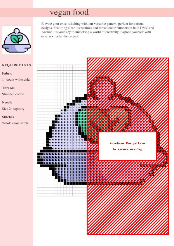 Indulge your passion for vegan cuisine and the art of cross-stitch with our charming ‘Vegan Delights’ pattern! This downloadable PDF pattern is a vibrant celebration of plant-based food, showcasing a mouthwatering array of fruits, vegetables, grains, and delectable vegan treats. Designed with clear, easy-to-follow symbols and a comprehensive color key featuring both DMC and Anchor thread numbers (making it easy to choose your favorite brand!), this pattern is perfect for stitchers of all skill levels, from beginner to advanced. Each element is rendered with exquisite detail, promising a rewarding and enjoyable stitching experience. The rich, appealing colors and intricate design make this pattern ideal for creating unique home décor, including wall art, kitchen towels, cushions, or tote bags. Download your pattern instantly and start stitching your delicious vegan masterpiece! Unleash your creativity and stitch up a culinary delight! The detailed color key simplifies the stitching process, ensuring a smooth and satisfying experience. Experience the joy of creating a beautiful and meaningful piece of art that reflects your love for vegan food and the satisfying craft of cross-stitch. This pattern makes a perfect gift for vegan friends or fellow cross-stitch enthusiasts! This cross stitch pattern is a perfect blend of culinary creativity and needlework artistry.