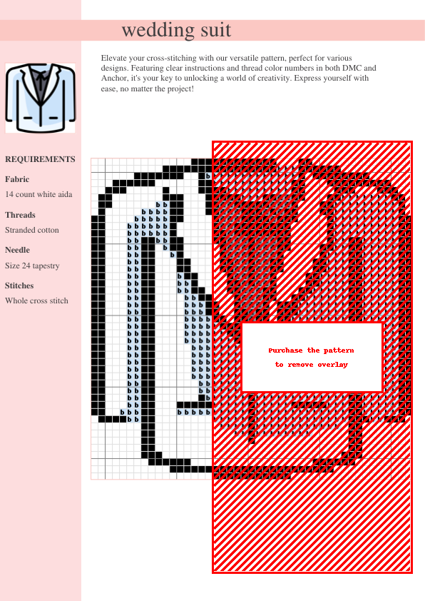 Capture timeless elegance with this exquisite cross-stitch pattern of a wedding suit! Meticulously designed for both experienced stitchers and ambitious beginners, this pattern offers clear, easy-to-follow instructions and precise DMC and Anchor thread color codes for flawless color matching. Create unforgettable wedding gifts, sophisticated home décor accents (imagine this framed as art, or adorning a pillow!), or cherished personalized keepsakes. This downloadable PDF pattern includes a detailed symbol chart, a key to DMC and Anchor thread colors, and stitch counts for accurate execution, ensuring a smooth and enjoyable stitching experience. The crisp lines and intricate details of the suit design guarantee a breathtaking, handcrafted masterpiece – a treasured heirloom in the making! Download instantly and begin your stitching journey! Ideal for intermediate and advanced stitchers. Perfect for adding a touch of personalized charm to any celebration or home.