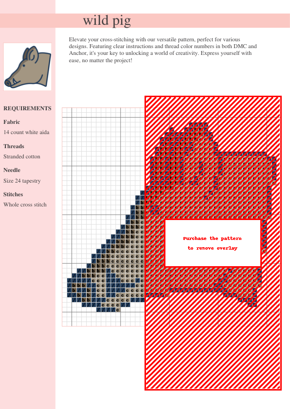 Embark on a whimsical cross-stitch adventure with our adorable Wild Pig pattern! This delightful design captures the charm of a playful piglet nestled in a serene forest setting. The pattern features clear, easy-to-follow instructions and includes both DMC and Anchor thread color numbers for a seamless stitching experience. Perfect for beginner to intermediate cross-stitchers, this versatile pattern offers endless possibilities. Imagine this charming piglet adorning your walls as framed art, transforming into a delightful ornament, or even personalizing a cozy pillow or tote bag! The intricate details of the pig and its forest surroundings will keep you engaged and satisfied throughout the crafting process. Download your instant PDF pattern (two pages) featuring a symbol chart and a complete thread list immediately after purchase. Unleash your creativity and bring this charming woodland creature to life! This charming pattern makes a perfect gift for cross stitch enthusiasts, crafters, and animal lovers. The pattern is designed to provide a fun and rewarding stitching experience, suitable for both experienced stitchers looking for a cute project and beginners ready to try something new.