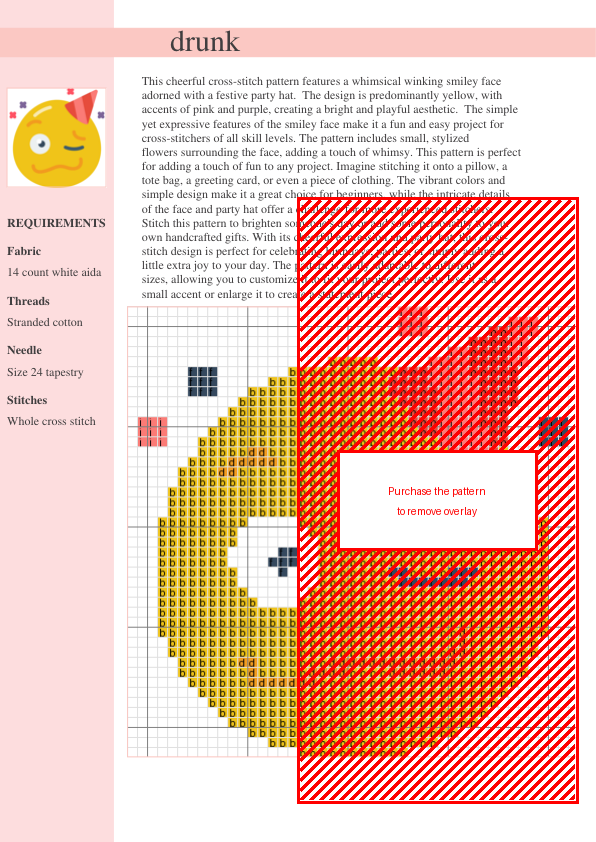 Add a cheerful touch to your life with this easy-to-stitch Winking Smiley Party Face cross-stitch pattern! Featuring a vibrant color palette and simple instructions, this instant digital download is perfect for cross-stitchers of all skill levels. Create fun and unique projects for any occasion.