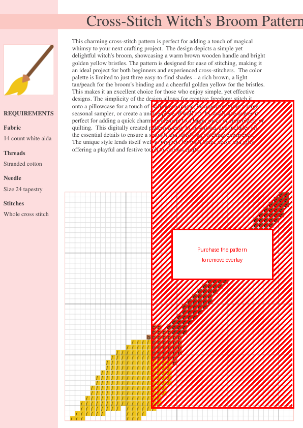Add a touch of magical whimsy to your Halloween decorations or handmade gifts with this enchanting cross-stitch pattern! This charming design features a witch’s broom with a warm brown wooden handle and bright, cheerful golden yellow bristles. The simple yet elegant design is perfect for cross-stitchers of all skill levels – beginners will appreciate the easy-to-follow instructions, while experienced crafters will enjoy a quick and satisfying project. The limited color palette (rich brown, light tan/peach, and sunny golden yellow) makes thread selection a breeze. Stitch it onto a pillowcase for a spooky yet cute touch, incorporate it into a larger seasonal sampler, or create a unique piece of wall art. Its compact size also makes it ideal for adding a delightful element to a larger embroidery or quilting project. This instantly downloadable PDF pattern includes a complete stitch guide, color key, detailed instructions, and a suggested DMC thread color chart for a seamless stitching experience. Unleash your creativity and add a dash of Halloween magic to your home décor, gifts, or next crafting project. Perfect for Halloween, autumn crafting, and adding a whimsical touch to any project.
