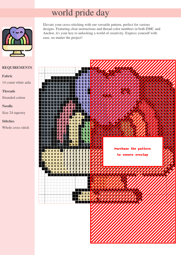 Celebrate World Pride Day with this vibrant and inclusive cross-stitch pattern! This design features a joyful rainbow heart encircled by interconnected flags representing the diverse LGBTQ+ community. Stitched with meticulous detail, the bold rainbow color scheme is easily achievable using readily available DMC and Anchor threads; color codes are clearly listed in the pattern for your convenience. The pattern includes clear and concise instructions, making it perfect for both beginner and experienced cross-stitchers. Download your PDF pattern instantly after purchase and start stitching! This design is ideal for creating a unique and meaningful wall hanging, pillow cover, or other personalized craft project. The finished piece is approximately 6″ x 6″ (dimensions may vary slightly depending on stitch count), making it a perfect size for various crafting projects. Express your support for LGBTQ+ rights and celebrate diversity with this beautiful and impactful piece of art. Show your pride!