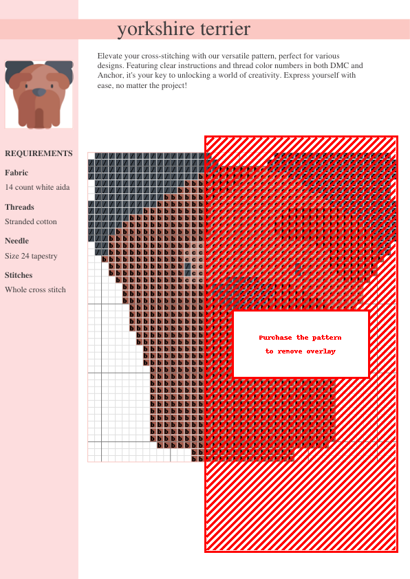 Stitch up some adorable charm with this delightful Yorkshire Terrier cross-stitch pattern! Perfect for cross-stitch enthusiasts of all skill levels, from beginners seeking a fun project to experienced stitchers looking for a detailed and rewarding challenge. This design features a realistically rendered Yorkshire Terrier, capturing the breed’s unique fluffy texture and expressive eyes. We’ve included both DMC and Anchor thread color codes for your convenience, ensuring a seamless crafting experience. The clear and concise instructions guide you step-by-step, making it easy to create this endearing canine companion. Imagine this sweet Yorkie adorning a charming wall hanging, a personalized pillow, or a unique and thoughtful handmade gift. This high-quality PDF download includes a two-page pattern with color-coded symbols and a complete list of required DMC and Anchor thread codes. Download your pattern instantly after purchase and start stitching your adorable Yorkshire Terrier today! Suitable for needlepoint enthusiasts too! This pattern is a perfect blend of realistic detail and achievable stitching, making it an ideal project for both beginners and experienced crafters. The final result will be a heartwarming addition to any home or a treasured gift for a loved one. The pattern utilizes a range of shades to capture the Yorkie’s coat, providing a beautiful and textured final piece. This digital download is perfect for creating a unique and personalized gift.