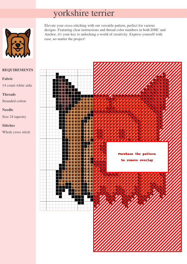 Stitch up some canine cuteness with this delightful Yorkshire Terrier cross-stitch pattern! This easy-to-follow design features clear symbols and a comprehensive color key using both DMC and Anchor stranded cotton thread codes, making it perfect for cross-stitchers of all skill levels, from beginners to experienced crafters. The charming Yorkshire Terrier is rendered with intricate detail, showcasing the texture of its luxurious fur. Notice the subtle shading used to bring this pup to life! This printable PDF pattern allows you to start stitching instantly. Imagine this adorable Yorkie proudly displayed on a cushion, wall hanging, or even a personalized gift – a truly unique and heartfelt present for dog lovers or yourself. The pattern is optimized for a satisfying stitching experience, balancing intricate detail with accessibility. Download your pattern today and embark on a rewarding crafting adventure! Perfect for adding a touch of whimsical charm to your home decor or creating a one-of-a-kind handmade gift.