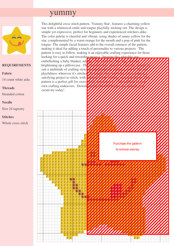 Embroider a smile with our ‘Yummy Star’ cross stitch pattern! This charming design features a vibrant yellow star with a whimsical, tongue-out expression. Perfect for beginners and seasoned stitchers alike, its simple yet expressive design is a joy to create. The cheerful color palette uses sunny yellows, warm oranges, and a pop of pink, creating a fun and playful aesthetic. Its simple lines make it a quick and rewarding project, ideal for adding a touch of personality to baby blankets, tote bags, pillowcases, or any project that needs a dash of fun. Download the easy-to-follow PDF pattern and unleash your creativity! This pattern is a perfect gift for cross-stitch enthusiasts or a fun treat for yourself. Enjoy the satisfying process of stitching this adorable star and the cheerful results. The pattern includes a color key and easy-to-read chart for a smooth stitching experience. This fun and easy cross stitch design is perfect for adding a touch of whimsy to your next crafting project. Suitable for cross stitch, embroidery, needlepoint, and crafting projects.